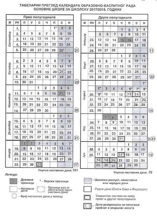 Školski kalendar za osnovne škole Srbije 2018/2019